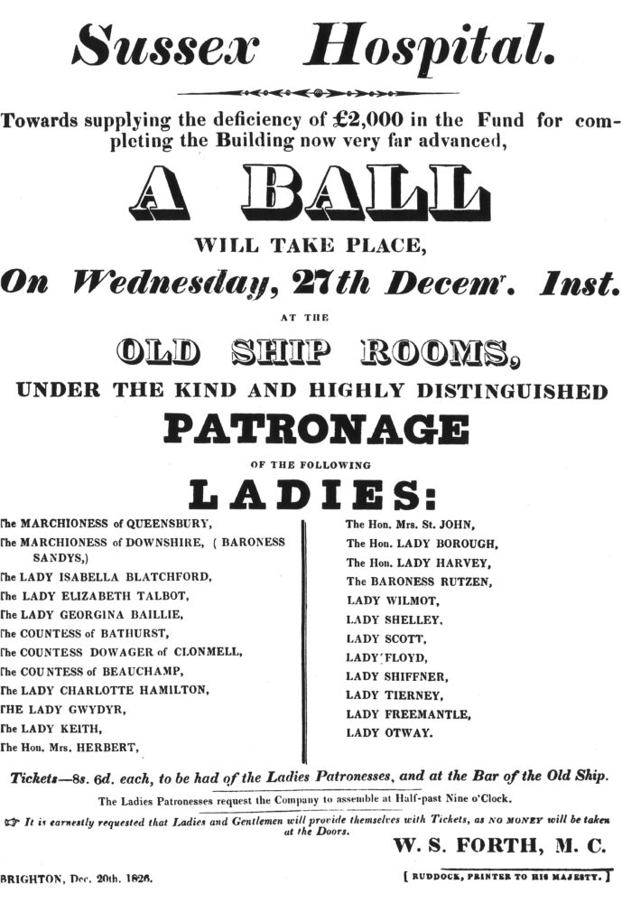 Promotional poster for ‘A Ball’ held to raise £2,000 towards the construction of [Royal] Sussex [County] Hospital in December 1826.