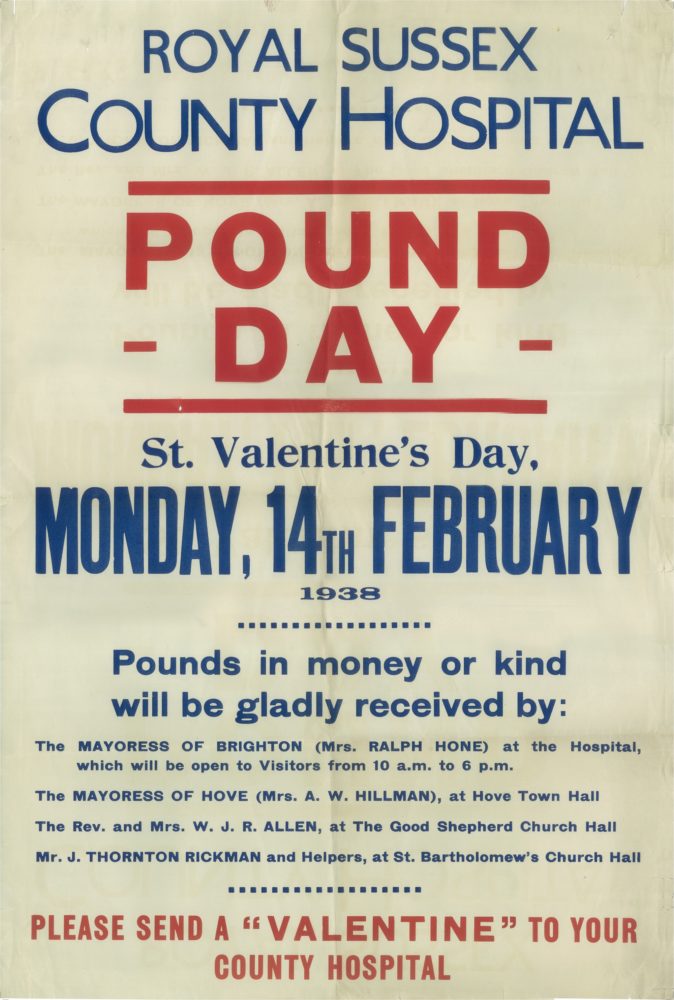 Pound Day, St. Valentine’s Day, 1938 promotional poster. The first Pound Day for Sussex County Hospital was held on St. Valentine’s Day in 1905. Pound Days were popular, with Sussex County Hospital’s first Pound Day held on 14 February 1905 – these continued annually during the first half of the 20th century, alongside appeals and fundraising by women’s guilds and musical fundraisers, including by those organised by the Blue Bird Brigade and a Chinese Fair held in 1920 at The Dome.